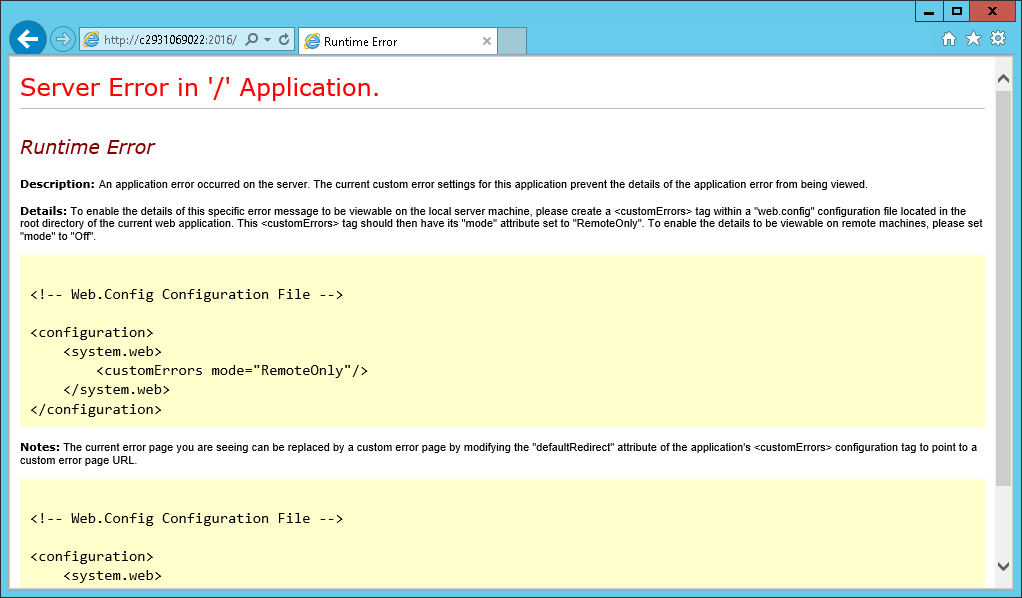 Oh no, this is starting to look serious, I mutter. But never despair, it can be something simple. So I do as this all-too-common error page suggests and flip the Central Admin website’s web.config customErrors mode setting to RemoteOnly.