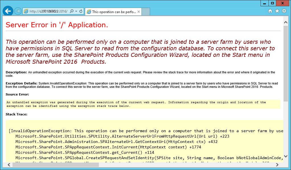 This operation can be performed only on a computer that is joined to a server farm by users who have permissions in SQL Server to read from the configuration database. To connect this server to the server farm, use the SharePoint Products Configuration Wizard, located on the Start menu in Microsoft SharePoint 2016 Products.