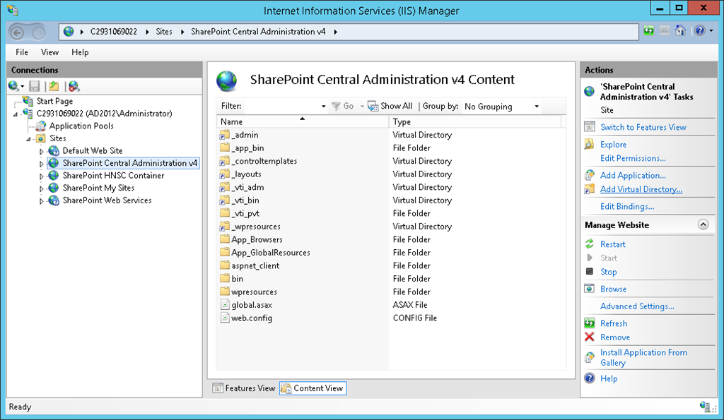 My favourite way to locate a SharePoint or IIS website root and its web.config file is to use Internet Information Services (IIS) Manager. So I select the website, in this case Central Admin, select Content View, and then Explore from the right panel Actions: